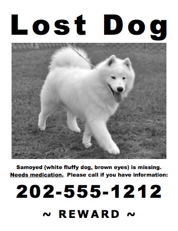 If someone found your dog, their likely first instinct is to call Animal Control but if they don’t live within your local government boundary then they may take them to another jurisdiction’s shelter (think Fairfax/Alexandria/Arlington). Call them morning and evening to see if they have your dog -- a “white fluffy dog - Samoyed.” Personally visit the shelters every day or ask someone to do it for you. Also contact Samoyed rescue groups (Mid-Atlantic Samoyed Rescue).